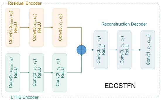 Generally, the primitive DCSTFN model adopts an “encoder–merge–decoder” architecture to address this problem. In the DCSTFN fusion model, the HTLS subnet and LTHS subnet function as Encoders extracting features from MODIS and Landsat images respectively. The fusion process is performed in a high-level abstract feature space to merge features from different data sources. To be specific, the extracted features are merged according to an assumption that ground feature changes observed from MODIS and Landsat images between the reference and prediction dates are nearly identical, which can be formulated as Equation (2).