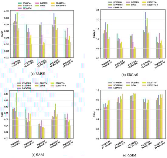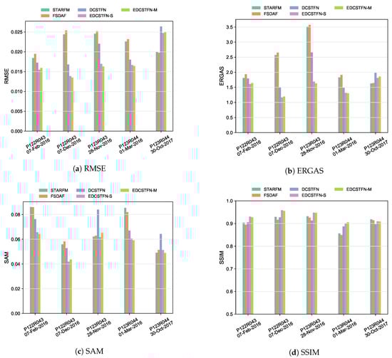 Currently, there is no internationally-accepted standard that can uniquely determine the quality of fused images [44]. Different fusion metrics have their limitations and can only reveal some parts of the fused image quality [45], thus, several metrics are selected for the evaluation in this experiment, including the root mean square error (RMSE), structural similarity index (SSIM), spectral angle mapper (SAM) [46], and relative dimensionless global error (ERGAS) [47]. The RMSE, formulated as Equation (11), measures the distance between ground truth and prediction. A small RMSE shows high accuracy.