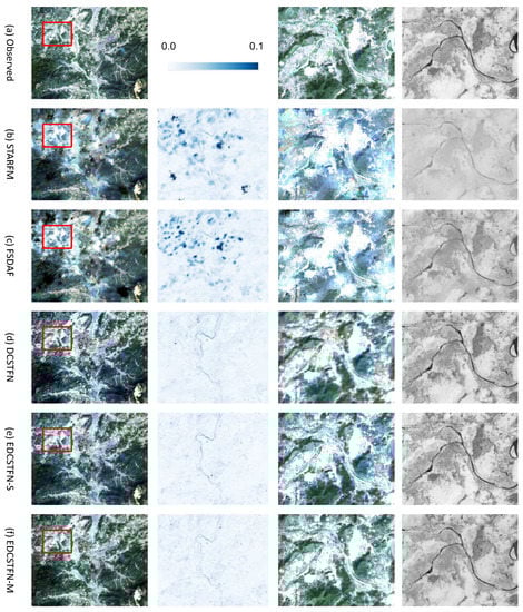 Figure 8 illustrates part of the results on December 7th, 2016 in the P122R043 region. The first column exhibits the standard true color composite images for the ground truth, predictions of STARFM, FSDAF, DCSTFN, EDCSTFN-S, and EDCSTFN-M. The second column gives the bias between fusion results and ground truth corresponding to the first column. The values are stretched between 0.0 and 0.1 to highlight the differences. The third column shows the zoomed-in details of the red rectangles marked in the first column. The last column is the calculated normalized difference vegetation index (NDVI), a commonly-used vegetation indicator in remote sensing, corresponding to the third column. First, the second row demonstrates that prediction errors from conventional methods are much more significant than deeplearningbased models. Second, the third column shows the EDCSTFN model sharpens miscellaneous ground features compared with the DCSTFN model, nearly as clear as the observed ground truth. This also implies the comprehensive compound loss function works quite well for image fusion tasks. Third, distinct white flakes are scattering in the results of STARFM and FSDAF, showing they failed to predict ground features in heterogeneous city areas. Fourth, the results of EDCSTFN-S and EDCSTFN-M do have some differences visually, but not significantly. Theoretically, four individual networks are trained for the EDCSTFN-S corresponding to the four spectral bands, and each network is specially optimized catering for the characteristics of each unique band, while the EDCSTFN-M is a one-size-fit-all network where all the bands are treated equally and some common features may be highlighted in this case. Training an EDCSTFN-S model for production is much more time-consuming than EDCSTFN-M does, and the accuracy improvement is not obvious, so multiple-band images can be safely used for training in normal cases. Last, the calculated NDVIs from CNN-based models are more close to the actual observation visually.