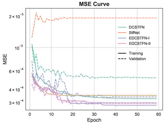 Data preprocessing for spatiotemporal fusion still followed the procedures conducted in the DCSTFN experiment. First, preliminary radiometric calibration and atmospheric correction should be performed. The level-2 data product already has undergone these routines. Then, Landsat image of each scene was cropped to the same size (4800 × 4800) to remove “no data” regions from the edge. Third, the corresponding MODIS data were resampled from MODIS sinusoidal projection to the Universal Transverse Mercator (UTM) and cropped to obtain the same geographical extent as the Landsat (the resampled image size of MODIS is 300 × 300 and the spatial resolution is 480 m). Finally, these processed MODIS and Landsat data were organized and grouped according to the acquisition date. The basic rule is that reference and prediction dates should be as close as possible, better within a quarter. For the model trained with one reference pair, each training data group consists of two MODIS images and two Landsat images on prediction and reference date respectively; for the model trained with two reference pairs, there are three MODIS and Landsat pairs. It should be also aware that the spectral range of each band should be matched in the fusion process, which means the spectral band of Landsat and MODIS to be merged should be within the approximate same range (see [7]). After data filtering, preprocessing and grouping, there were fourteen data groups for each area. For each area, all groups are needed to be split into training and validation datasets randomly. Validation data are not involved in the training process, only used for testing. The minimum requirement for training data volume is related to the complexity of the model. In practice, it could be considered to have met the requirement as long as the model can reach convergence and does not overfit. During training, images were further subdivided into small patches considering the computer memory consumption and entered into the network batch by batch. In our experiment, the patch size for MODIS was 50 × 50 and the sliding stride for subsetting was 30 × 30. Accordingly, the settings of Landsat are sixteen times as MODIS. In the prediction phase, small patches are processed through the trained network and then stitched together to form the whole scene.