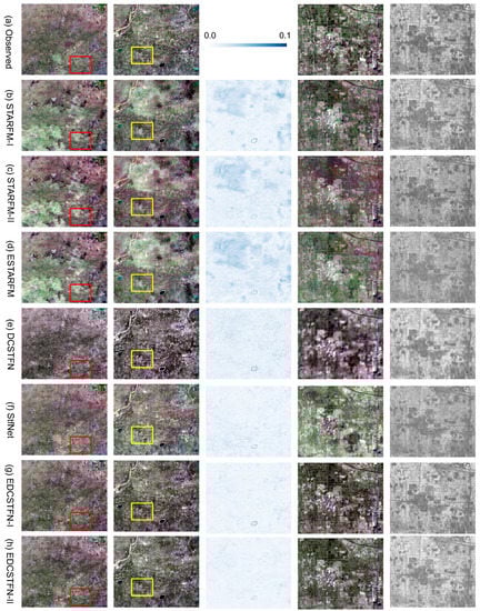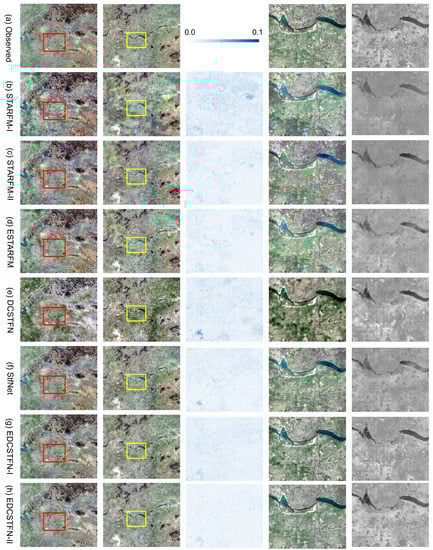 Figure 9 exhibits part of the results on 30 October 2017 in the P123R044 region, where the predictions of conventional methods produced fewer errors than the DCSTFN model. The arrangement of the subfigures is the same as above. It can be seen there are some distinguishable small abnormal blue patterns in the results of STARMF and FSDAF from the first column. Overall, the prediction of EDCSTFN-M resembles ground truth best visually. From the third column, there are noticeable abnormal patterns produced by STARMF and FSDAF marked with yellow rectangles, while the EDCSTFN model yield quite reliable results for heterogeneous city areas. From the last NDVI results, still, the EDCSTFN model represents the most accurate results compared with others. In brief, although the conventional methods produce smaller errors averagely in this data group, there are some obvious mistakes in the fusion results, which means the conventional model is not so robust as the EDCSTFN model. Moreover, the outlines of the city are much more clear with the EDCSTFN model seen from the third column, which means the EDCSTFN model significantly improves image sharpness compared with the DCSTFN model.
