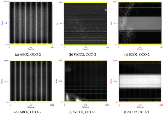 The OCO-2 and OCO-3 spectrometers use nearly 500,000 pixels to measure three near-infrared bands with high resolution. The three channels measure the O ABO2 band at m, the “weak” CO (WCO2) band at m, and the “strong” CO (SCO2) band at m. At the focus of each spectrometer is a Teledyne Hawaii-1RG (Teledyne Imaging Sensors, Camarillo, CA, USA) FPA consisting of 1024 × 1024 pixels that measure 18 m by 18 m each. The O detector is Si, while the CO detectors are HgCdTe. The OCO-2 detectors were procured as spares for the OCO mission, while the OCO-3 detectors used a newer process. The columns of the detector record different wavelengths, while rows record different field angles. Due to the narrow spectrometer slit, only 220 rows near the middle are read out. Of these, roughly 180 rows are illuminated, and the middle 160 of those rows form the science area and are used to retrieve CO. While the field of view across the slit is spatially-resolved across 160 of its science rows, the spectrum is dispersed across 1024 of the FPA columns. To reduce data volume, the rows are averaged into eight spatial footprints; thus, an array of 8 × 1024 is returned for science. Because this summation is performed on board, prior to bias and gain corrections, individual pixels that are dead or respond anomalously to light or the instrument environment must be identified and eliminated from the sum. Figure 1 shows images of the three full FPAs in the dark. For more information on the FPA, related components and the OCO-2 and OCO-3 instruments themselves please refer to [,,].