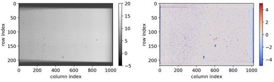 The collected dark and “flat-field” lamp images, both measuring 220 × 1024 pixels, in uncalibrated DN, are the two data sources used for bad pixel identification. These images are obtained from uncalibrated Level 1A instrument data products []. In this work, the DN values from these images are transformed into a collection of interpretable and statistically well-defined features that are then input into a machine learning model that is trained to differentiate between bad and good pixels. The computed features are summary statistics that capture a variety of pixel characteristics including similarity to neighbors, temporal trends, and instability.
