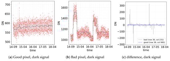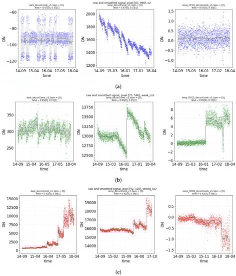 Figure 9 shows three examples of the identified bad pixels from each FPA for OCO-2. The plots show the signal DN time series plots for roughly four years of the OCO-2 mission. Figure 9a shows one type of bad pixel behavior, Random Telegraph Noise [], in the dark that is recognized by the classifier. The signal in this case is stable; however, it appears to be trimodal, indicating that the pixel can be operating in three different regimes. Moreover, this behavior appears to be triggered and reset by decontamination cycles. Another example of bad pixel behavior is shown in Figure 9b, where the pixel looks normal in the dark, however, it stops responding correctly to the light in the middle of the mission. Finally, in Figure 9c, the pixel becomes increasingly “hot” in the dark and unstable with each decontamination cycle. As a result, it also starts showing insensitivity to light as shown in the middle and right panels of Figure 9c.