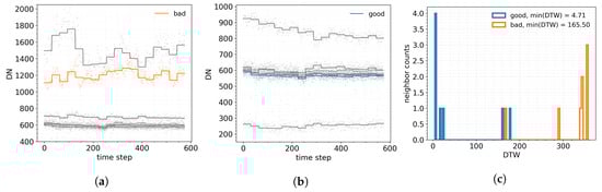 (a) an example of an OCO-2 bad pixel smoothed signal (orange) compared with its nearest neighbors, and (b) an example of a good pixel (blue) with the corresponding nearest neighbors, and (c) histograms of DTW values for the bad (orange) and the good (blue) pixels computed for all the displayed nearest neighbors. DTW values for the good pixel are mostly near zero, with two values, representing the two bad pixel neighbors from (a) having higher DTW distance. In (c), the bad pixel is associated with much higher DTW distances, with the minimum corresponding to the highest DTW value for the good pixel.