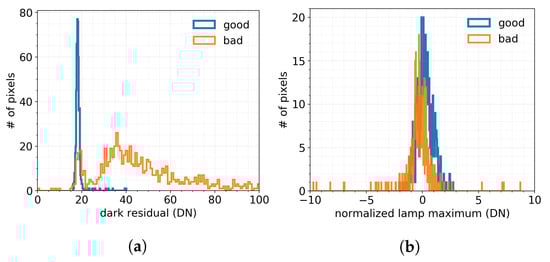 We summarize the computed features in Table 1. All of the features, except DTW and temperature correlations, use the wavelet-smoothed signal. DTW is more robust to noise in the time series, while temperature correlations use the raw time series to preserve the thermal sensitivity. The extracted features represent the majority of aberrant pixel behavior and can capture the main differences between good and bad pixels. Pixels could thus be differentiated not only by one feature, but by several jointly, which can vary for each individual pixel. Figure 5 shows examples of the computed dark residual standard deviation and lamp maximum DN values for OCO-2 SCO2 band, displayed as histograms that are separated by good and bad classes of pixels. Figure 5 shows that dark residual standard deviation is more effective in separating the bad pixels for this band; however, not all of them will be separated by this feature, as the existence of a small mode on the left shows. The bad pixels in this mode are captured by other features. Lamp DN maximum, on the other hand, does not explain most of the bad pixels in this band; however, it can identify various individual outliers.