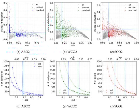 Fine-tuning the final thresholds is based on the desired number of false positives, where the expected number is based on instrument knowledge. Figure 6d–f demonstrate how the thresholds can be adjusted using cumulative distribution functions of false positives. In Figure 6b, for example, the approximate threshold for the WCO2 band could be somewhere between 15–30% for the likelihood minimum, corresponding to 99.9% of the distribution, but the number of false positives obtained closer to 15% would give a more reasonable and conservative estimate, or around 500 instead of 100 new bad pixels, as shown in Figure 6e. The threshold of 10% is too tight and would have doubled the number of new bad pixels to around 1000, with most of them representing “borderline” cases.