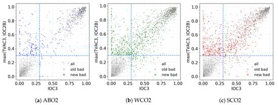 Joint distributions of the likelihood summary statistics for OCO-3: (a) ABO2, (b) WCO2, (c) SCO2, with the blue dashed line indicating the chosen threshold. The likelihoods from the second IOC period are displayed on the x-axis labeled IOC3 and the maximum likelihood of TVAC and the first IOC period, labeled IOC2B, are on the y-axis.