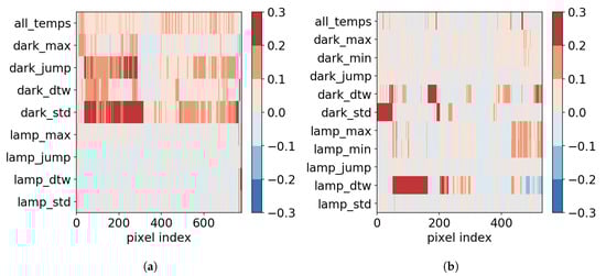 Figure 8 shows the contributions of features for all the new SCO2 bad pixels for both OCO-2 and OCO-3. New bad pixels in the OCO-2 FPA shown in Figure 8a can be mostly attributed to the changes in the dark signal, specifically instability in the dark signal as shown by large positive contributions from the dark residual standard deviation and the dark jump features. The lamp signal, on the other hand, has a small tendency to reduce the likelihood contributions, indicated by a very light blue corresponding to these features on the bottom of the figure. The instrument temperatures for OCO-2 make very small individual positive contributions to the likelihoods; however, their additive effect is generally impactful, with all six of the thermal contributions potentially adding up to 20%. OCO-3’s new bad pixels in Figure 8b, on the other hand, show weak contributions from anomalous thermal responses, and a larger number of bad pixels can be attributed to the lamp anomalies, specifically to their lamp signal differences with the neighbors and the light sensitivity as suggested by lamp minimum and maximum.