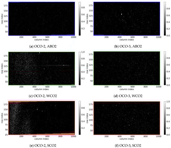 Finally, the images of pixel likelihoods for OCO-2 and OCO-3 are displayed in Figure 10. The resulting bad pixel maps closely follow these likelihood maps, which provide a general view of the distribution and a degree to which some areas of the FPA are bad. The fraction of the bad pixels for both instruments is very small, but the likelihood maps are different. While the ABO2 in Figure 10a appears to be less affected by the presence of the bad pixels than OCO-3 ABO2 band in Figure 10b, the OCO-2 FPAs for the WCO2 and SCO2 bands in Figure 10c,e exhibit twice as many bad pixels than those for OCO-3 in Figure 10d,f. The WCO2 and SCO2 bands have large areas corresponding to the longer wavelengths that are largely contaminated by bad pixels. WCO2 also has a prominent anomalous region at around column 900 that propagates through the “hot” row. These areas as well as large clusters of bad pixels throughout the FPAs can complicate the detection of bad pixels, as they can distort even the robust summary statistics, such as medians. On the other hand, the “W-pattern” and other regular detector artifacts have correctly not been identified as bad pixels.