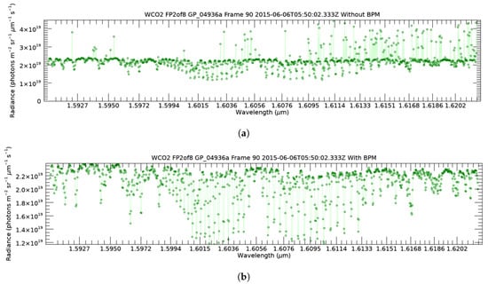 A derived spectrum for OCO-2 WCO2 band with wavelength on the x-axis and radiance on the y-axis with (a) bad pixels not removed and (b) bad pixels removed.