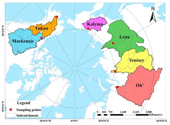 Map of the study area with delineated watershed boundaries of the six largest Arctic rivers (black lines), watershed boundaries of sub-catchments (gray lines), and sample locations (red dots).