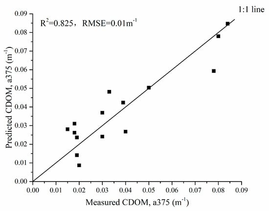 The model displayed both a high explanatory capability and a high predictive power with an R2 of 0.825, an MRE of 31.33%, and an RMSE of 0.01 m−1. Figure 2 demonstrates the correlations between the predicted and measured CDOM (a375). The scatters fell evenly on both sides of the 1:1 line, and all the predicted CDOM values were within the field measurement range. The less satisfactory performances of the previous models with our data might be attributed to the differences in the sensor bandwidths, water qualities, and biogeochemical conditions.