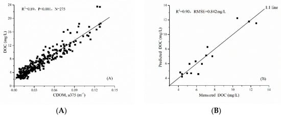 (A) Linear regression between the in-situ dissolved organic carbon (DOC) and CDOM (a375), and (B) the relationship between the measured and predicted DOC.
