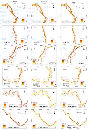 Spatial distributions of DOC for the six largest Arctic rivers retrieved from Sentinel-2 images. The arrows point to the river mouths. The first column (A,D,G,J,M,P) is the average DOC for spring, the second column (B,E,H,K,N,Q) is average DOC for summer, and the last column (C,F,I,L,O,R) is the annual average DOC. Each row represents the DOC variation for one of the six rivers: Yenisey, Lena, Ob’, Kolyma, Yukon, and Mackenzie.