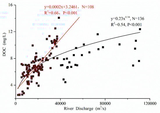 Correlations between the DOC concentration and river discharge. The black squares and black line represent all available data, and the red triangles and red line represent the data with discharges less than 40,000 m3/s.