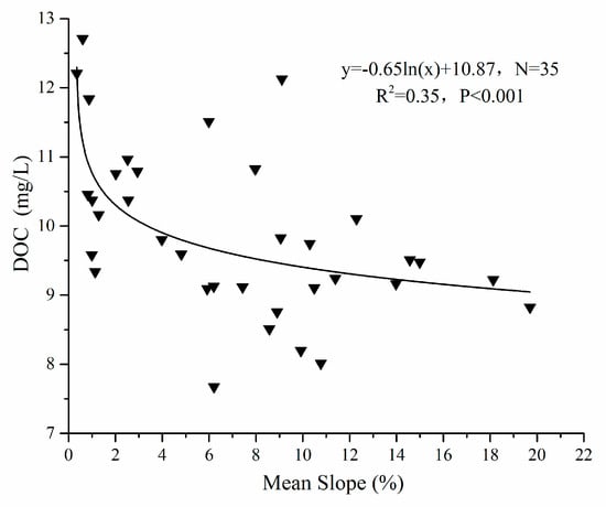 According to previous studies [38,39,47], the watershed slope is a promising indicator of the DOC variation in rivers. To analyze the similarities and differences for the six rivers, we calculated the mean slopes of 35 sub-catchments in Arctic regions, as described in Section 2.3, and quantified the correlation between the watershed slopes and the DOC concentration. As shown in Figure 6, there is a weak negative correlation between the DOC and the watershed slopes of all 35 sub-catchments (R2 = 0.35, P < 0.001), indicating that gentler slopes result in high DOC concentrations and steeper slopes result in low DOC concentrations. Since the study area in this paper (~20.5 × 106 km2) is much larger than those in previous studies, the differences in the topographic features and geographical variations might introduce more uncertainties to our results.
