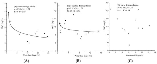 Correlation between the watershed slope and DOC concentration for (A) small, (B) moderate, and (C) large drainage basins.