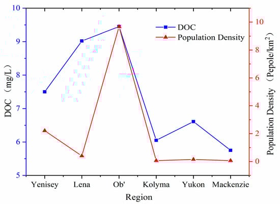 Human activities, such as the destruction of shrubs and vegetation, infrastructure construction, changes in cultivation modes, and rapid urbanization, would interfere with natural processes and the output environment of organic matter in watersheds [75]. As shown by the spatial distribution of the DOC in Arctic rivers (Figure 4), the DOC concentration was higher near riverbanks with cities or villages than midstream, indicating a possible influence of artificial factors on the DOC variation.