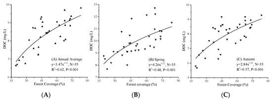 Correlation between forest coverage and the DOC concentration: (A) annual average, (B) spring, and (C) summer.