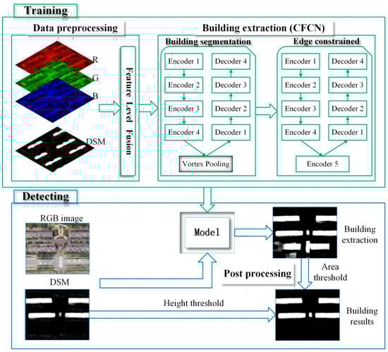 The input data for the proposed building extraction approach is a series of four-band fusion images that are composed of DSM and UAV images. Figure 1 illustrates the detection architecture of the proposed approach. It mainly includes the following three processes.