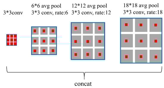 The spatial information of the objects has an important influence on improving the segmentation accuracy in the process of building segmentation. The vortex module makes full use of context information by describing local interactions between neighborhood locations and the near-object region generally contains more semantic information, thus achieving better feature representation []. The algorithm of the CFCN selects the appropriate expansion rate and pooled convolution kernel for the data set, unlike the vortex module in []. As shown in Figure 3, the vortex module uses a 6 × 6, 12 × 12, and 18 × 18 average pooling for the feature maps in parallel, and the pooling layer enables the network to reduce the amount of computation and obtain global context information. The small pooling can better express the building details, and the large pooling can help obtain coarse building context information. Finally, four convolution layers of parallel expansion ratios (1, 6, 12, and 18) are used, and the convolved four feature maps are aggregated.