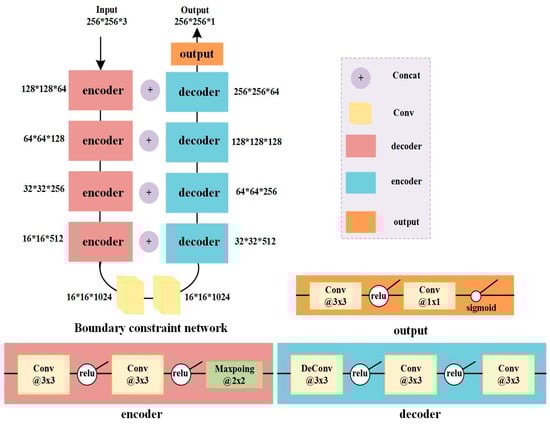 The boundary constraint network is a general U-net network, which is an encoding-decoding process. Down-sampling four times in the encoder is a process of feature extraction. The low-level extract features are more inclined to form the basic unit of the image. The high-level extract features approximately represent the semantic information of the image; the decoding process is the reverse operation of the encoding process. Up-sampling for four times restores the size of the original image, and Figure 5 shows its architecture. Input data of the boundary constraint network is the coarse building feature maps, which are the outputs mentioned in Section 2.3.1. A chained U-net network corrects the coarse building feature map. In this process, the U-net network will train the coarse building features to compensate for the incompleteness of the boundary in the extraction of coarse building features, the existence of holes in the building surface, and the “speckle” noise.