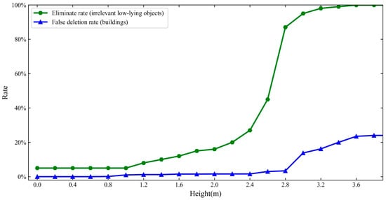 A height filtration threshold τ is used to refine irrelevant low-lying objects, such as fence, roads, and hardened ground, τ should be large enough to eliminate possible interference, but small enough to retain low-rise buildings. After selecting τ, if the absolute height obtained from the DSM is less than τ, the corresponding pixels are deleted. When the height is 2.8 m, effectively eliminating irrelevant low-lying objects and deleting false buildings can achieve a better balance (Figure 6). In this study, the height threshold τ is set to 2.8 m higher than the surrounding mean ground height.