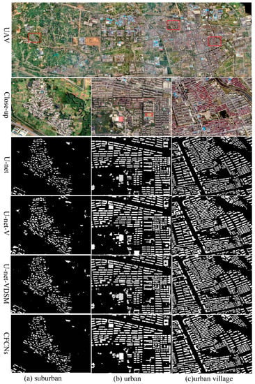 Table 3 shows that the U-net-V showed an increase in the building recall rate over the U-net from 93.41 to 94.62% by adding the vortex module, which indicated that the vortex module effectively utilizes the context feature of low and dense buildings in urban villages. Furthermore, adding DSM features can also improve the recall rate, and the U-net-VDSM recall rate can reach up to 98.75. This is because DSM can effectively reduce the probability of dividing the hardened road into buildings, which effectively improves the accuracy and recall rate of building extraction. It can be seen from IoU that U-net-V was slightly better than U-net. This is because the vortex module was used to increase the recall rate of low-rise and dense buildings in the urban village, and the vortex module has certain advantages for building boundary recognition. The performance of U-net-VDSM is better than U-net-V in IoU. Corner absence was effectively reduced, as DSM increased the recall rate of buildings at the edge of the image. However, there was an increase in building adhesion. Utilizing CFCN could rectify the lack of corners for buildings covered by trees. Moreover, it can also restrain the building adhesion that DSM causes, and the IoU can reach up to 95.76.