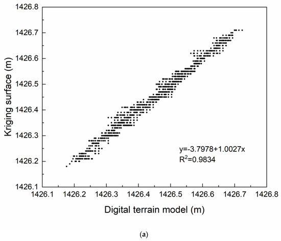 Scatter plots for (a) G1, (b) G2, and (c) G3. The x coordinate represents the testing points of the DTM for surface height and the y coordinate represents the testing points of the kriging surface.