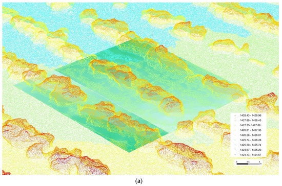 Figure 7a shows the CHM obtained by subtracting the kriging surface from the DSM, which clearly described the belt boundaries. According to Equation (4), the volume of the shrub belt is calculated as the total volume of all quadrangular prisms based on the bottom area (choose pixel size, 0.1 m ) multiplied by the height (canopy height), as shown in Table 3.