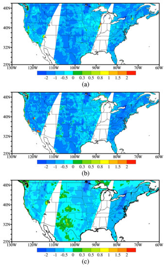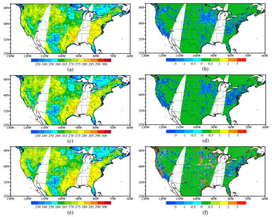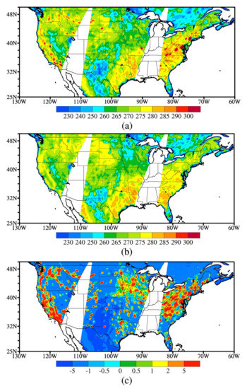 (a) Spatial distribution of brightness temperature of the 6.9 GHz, (b) 10.7 GHz horizontal polarization channels, and (c) their differences (6.9–10.7) over the North American continent on 1 September 2016.