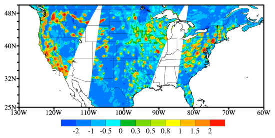 Figure 2 shows the distribution of RFI-contaminated data identified by the normalized PCA method for the 6.9 GHz horizontal polarization channel over the United States. As seen from this figure, the first principal component coefficient is typically between −2 and 1.0, and the red area in the figure (i.e., where the coefficient of the first principal component is greater than 2.0) indicates a higher probability of RFI occurrence. The test results (Figure 2) show that most large cities in the United States have pronounced radio interference signals, especially cities along the west coast.