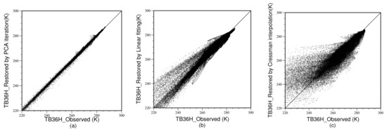 After correcting the abnormal values, it is necessary to verify that the corrected brightness temperature is reasonable. Although there were no real observations for comparison, the high spatial correlation of brightness temperatures between different channels was a good validation metric. Therefore, the brightness temperatures of the 10 GHz-H channel were selected to verify whether the channel correlation was retained by the new method. Figure 10 shows a scatter plot of the brightness temperatures of the 10 GHz-H channel and those of the 6 GHz-H channel. There were many abnormally high values of observed brightness temperature in the 6 GHz-H channel, even exceeding the dynamic upper limit of the instrument of 350 K. However, these abnormally high values disappeared after restoration. Moreover, the brightness temperatures restored by the PCA iterative method maintained a high correlation with the 10 GHz-H brightness temperatures, whereas the brightness temperatures obtained by the Cressman interpolation method could not maintain a good consistency with the brightness temperatures of the 10 GHz-H channel. However, there were still some high values in the brightness temperatures reconstructed by the linear fitting method and the Cressman interpolation method.