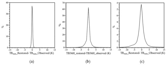 The probability density distribution (PDFs) of the difference between observed brightness temperature and restored brightness temperature for the PCA iterative method (a), linear fitting method (b) and the Cressman interpolation method (c).