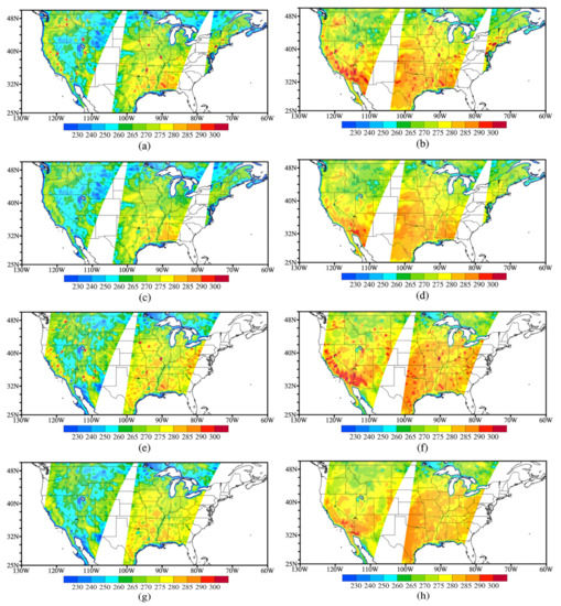 The spatial distribution of the observed (a,b,e,f) and restored (c,d,g,h) brightness temperatures at 6 GHz-H (a,c,e,g) and 6 GHz-V (b,d,f,h) on 5 September 2016 (a–d) and 7 September 2016 (e–h).
