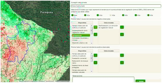 Expert knowledge can provide a source of information to help validate and understand the underlying causes of the productivity trend in the territory. In large countries, such as Argentina, gathering expert knowledge for all areas represents a challenge. To gather expert data at a low cost and in a simple and fast way, a web-based tool was developed using open and free software. A JavaScript interface was built to connect the experts via a web page to a GeoServer application [37] and a PostgreSQL database. Each expert was given login credentials (username and password) and a tutorial explaining how to use the online application. After logging in, the interface shows a Google Earth high resolution satellite image of Argentina as a base map and the polygons corresponding to the vegetation units of the country [38]. By clicking on the map, experts could choose the polygon (vegetation unit) to verify, and then they were presented with a panel in which they could visualize each primary productivity trend map, as shown in Figure 1. After viewing the six maps, experts were asked to select the one that best represented the spatial pattern of land productivity trends between 2000 and 2018 in their region of expertise. They were also asked to select, in order of importance, three causes for positive trends and three causes for negative trends. A list of 190 experts in the subject was provided by different institutions, such as The National Council of Science and Technology (CONICET) and the National Institute of Agropecuarian Technology (INTA), which were invited to participate.