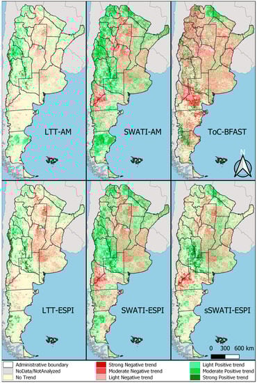 LTT and SWATI methods were calculated both with the annual mean NDVI time series (LTT-AM and SWATI-AM) and with the ESPI time series (LTT-ESPI and SWATI-ESPI), SSWATI was calculated with the ESPI (SSWATI-ESPI), and the ToC-BFAST was calculated with the original 16-day NDVI product time series. Thus, a total of six primary productivity trend maps at a national level were obtained.