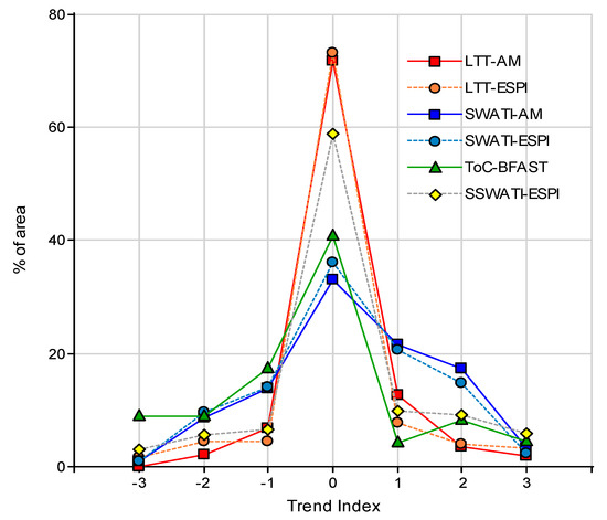 Land degradation has historically been considered a major environmental problem in Argentina, and results found by our analysis confirm that perception. On average, decreases of land productivity indicate that 20% of the Argentine territory has experienced degradation processes between 2000 and 2018. Single model estimates varied between 9% and 35.5% (LTT-AM and ToC-BFAST). Spatially, most models agree with degradation occurring in northern Patagonia and the Dry Chaco, as shown in Figure 2, whereas visible differences between the ToC-BFAST and the rest of the indicators were found, as shown in Table A2. For all methods, the most frequent category of trend intensity (TI) was “No Trend”, however there was a large range in the percentages categorized as such (between 33% and 73%), as shown in Figure 3. The percentage of land with positive trends was 26% on average and was always higher than the negative trends, excepting for the ToC-BFAST (17%) map. Positive trends were more frequently found by the SWATI indicators (42% and 37% for AM and ESPI) and less frequently in LTT indicators (18% and 15%).