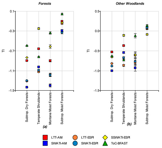 Differences in mean trend intensity (TI) in deforested plots obtained from six different primary productivity trend maps in: (a) forests; (b) other woodlands. Ecosystems are ordered in increasing precipitation level from left to right.