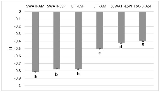 Average TI in all plots where deforestation was recorded was −0.82 for the SWATI-AM map, −0.78 for LTT-ESPI, and −0.78 for SWATI-ESPI (Figure 5). These three maps were regarded as the best performers in detecting negative trends of primary productivity in deforested plots, with SWATI-AM showing the lowest values. The LTT-AM average TI was −0.51, whereas SSWATI-ESPI and ToC-BFAST average TI were higher than −0.5. These results show that when calculating LTT indicators, the use of the ESPI time series instead of annual mean NDVI increases the ability to detect forest loss in all the regions.