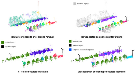 There are many scenarios in cities where trees and poles are connected and overlap. Many researchers have focused on these problems. Li et al. addressed this problem by proposing a density-based clustering algorithm [25]. The object locations are identified first and then the connected objects are separated by using the 3D object density variations. Yu and Glowinski utilized the graph-cut method from computer vision to separate connected and overlapped objects [21,22,23]. With a given object location, a k-nearest neighbor graph was built, and then the connected objects were separated based on energy minimization.