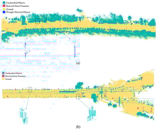 Figure 12. Pole-like street furniture extraction results: (a) false extraction results from Binhu Dataset; (b) undetected objects from Zanglong Dataset.