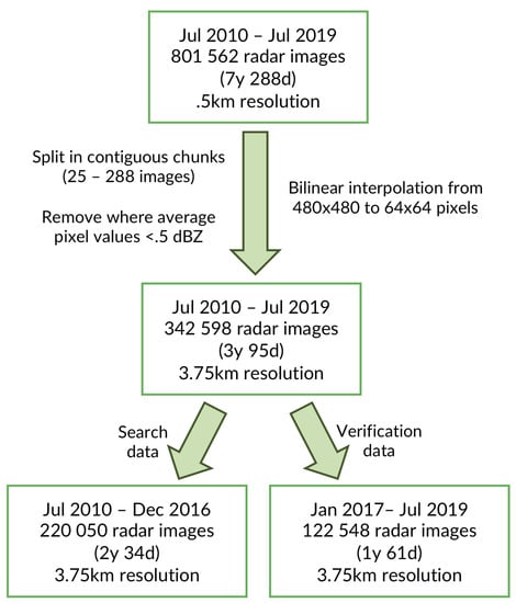A simple bilinear resize was applied to all the selected data to obtain 64 × 64 pixel images, corresponding to a resolution of 3.75 × 3.75 km. This was chosen for similar reasons to the ones described in []: to reduce the computational time of the experiments and extend the range of tested parameters combinations; to remove small scale variability; and, in our case, to also remove any possible residual noise and scatter in the MAX(Z) product. Figure 1 summarizes the data preprocessing pipeline.