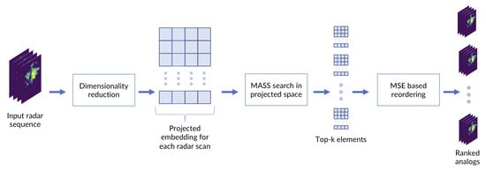 The second phase uses the MASS algorithm to search through the embedding search space and find the closest matches for the query data. To this aim, the embedded vectors of all the images in the search space are concatenated together following their natural time order. The result is a vector of length × . The embeddings of the queries are concatenated in the same fashion, generating vectors of size × t for each query, where t is the time length of the search query (the number of images in the sequence). The MASS algorithm is used to compare the query vector with the search space vector and extract the indexes of a desired number k of closest Euclidean profiles. The use of the Euclidean search is possible because the embeddings are projected by UMAP into a geometric space. As last step, the image sequences corresponding to the indexes of the top k profiles are compared and reordered by computing the MSE with respect to the query image sequence (in the low-res 64 × 64 image space), generating the final analog ranking. The desired number of final analogs can be selected by slicing the MSE reordered k analog vector to the final desired size of top-a analogs, with . There are two reasons why performing a partial reorder of the top k results in image space before selecting the final analogs is useful: first, even if the dimensionality reduction method works ideally on all cases and always returns the same top k items that an MSE search (the expressions “MSE search” and “MSE reorder” in the text, are always to be considered as operations computed by comparing radar images in the low-resolution 64 × 64 image space) would, there is hardly any guarantee that those will be returned in the same order (this is discussed in Section 2.6 and Section 3.2). The second reason is that MASS can perform such a fast search because it compares the vector profiles in the frequency domain; although the computed rankings for the profiles are exact, it may match a sequence with a very similar profile of the query vector but with a constant shift on all coordinates. This is indeed a rare occasion, but the partial MSE reordering is overall useful to move those spurious matches at the bottom of the ranking. Therefore, although we want to avoid computing MSE between the query and all the image archive, we can afford a small configurable number of MSE comparisons that can greatly improve the quality of the final ranking. The scheme of all steps of the workflow is summarized in Figure 2.