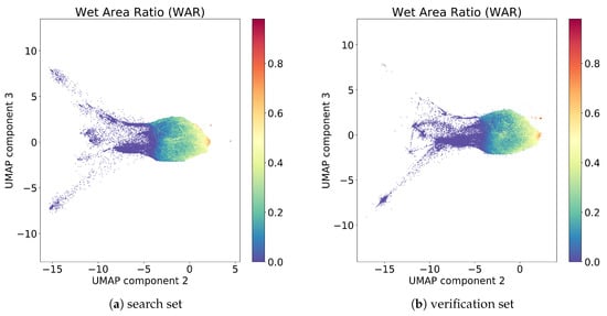 UMAP embedding visualization of the second and third components for search space (a) and for verification space (b). The embeddings are colored by wet area ratio (WAR).