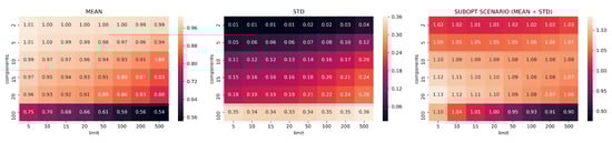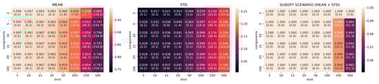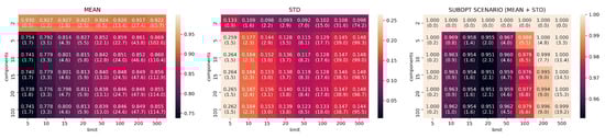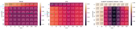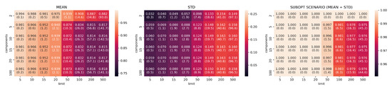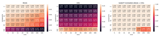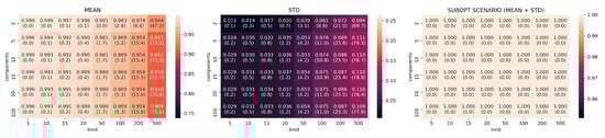Jaccard values for PCA with different values of limit k and components d (darker/lower is better). The number in parentheses is the cardinality of the intersections between the top-k PCA list and the top k MSE list. Mean, standard deviation, and the “suboptimal scenario”. given by the sum of mean and standard deviation. are reported.