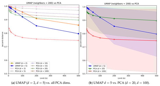 UMAP Jaccard score for the chosen value of neighbor vs. PCA. Only and are drawn for UMAP, as the values are overlapping for d from 5 to 100. In panel (b), the shade represents the standard deviation.