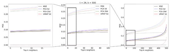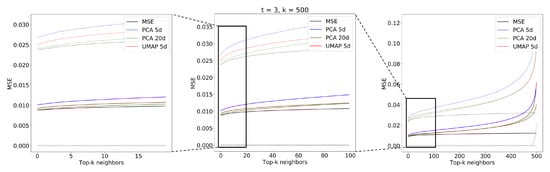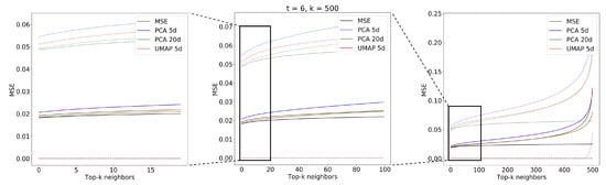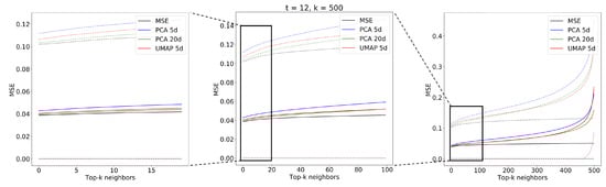 The evaluation of the spatiotemporal analog search performance was implemented as explained in Section 2.7. We used the combination of UMAP and MASS (MASS-UMAP) to find analogs for sequences of different lengths. We tested values corresponding to sequences of 15, 30, 60, and 120 min, respectively. For comparability, we used the same number of sequences with the same start times for all values of t. The sequences were chosen from the query set, starting from the first index and leaving whenever possible 100 images of gap between the beginning of the next sequence: this avoided sequence overlapping and also such a gap was sufficiently long to guarantee complete spatiotemporal decorrelation between the chosen sequences. The total number of extracted sequences after such processing was 1226. We compared the best UMAP configuration (, ) with respect to the sequences found by MSE and the sequences found by PCA with 5 and 20-components. Figure 13, Figure 14, Figure 15 and Figure 16 show the mean MSE of the models with different values of t and a MSE reorder on the top elements.