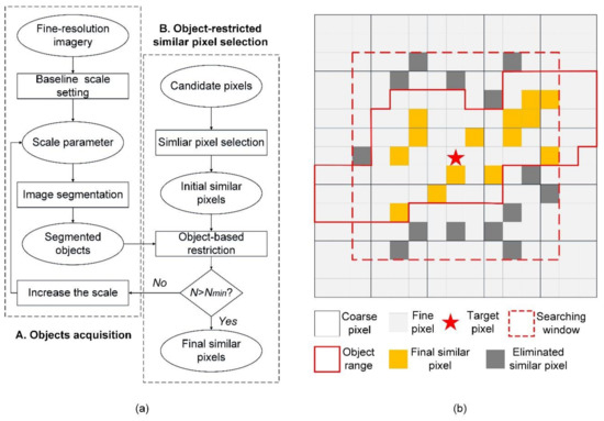 The schematic diagram of the proposed spatiotemporal data-fusion framework. (a) The workflow of the proposed framework, and (b) the illustration of the object-restricted similar pixel selection method.